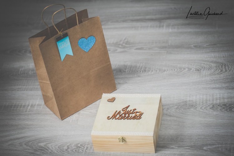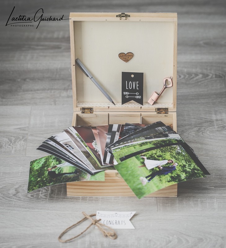 Pour mes futurs mariés ( certains présents ici ) je vous propose à partir d’aujourd’hui une box en supplément de votre forfait que j’ai conçu moi même, qui contiendra : votre clef usb , 50 tirages photos en 10×15 cm, une photo encadrée en 10×15 cm, un stylo élégant, un duo de porte clefs Love, le tout avec décorations et dans une boite en bois, elle même contenue dans un joli sac 🙂