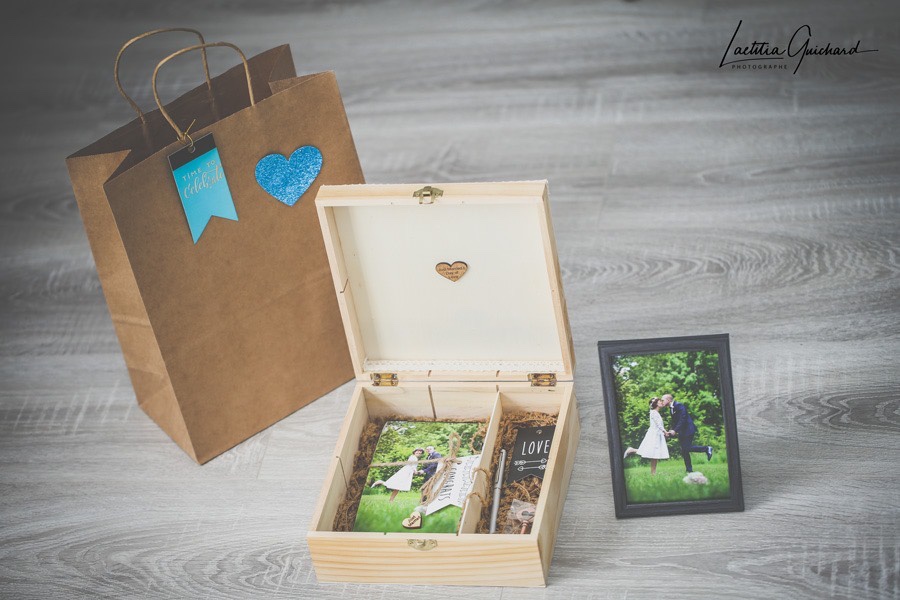 Pour mes futurs mariés ( certains présents ici ) je vous propose à partir d’aujourd’hui une box en supplément de votre forfait que j’ai conçu moi même, qui contiendra : votre clef usb , 50 tirages photos en 10×15 cm, une photo encadrée en 10×15 cm, un stylo élégant, un duo de porte clefs Love, le tout avec décorations et dans une boite en bois, elle même contenue dans un joli sac 🙂
